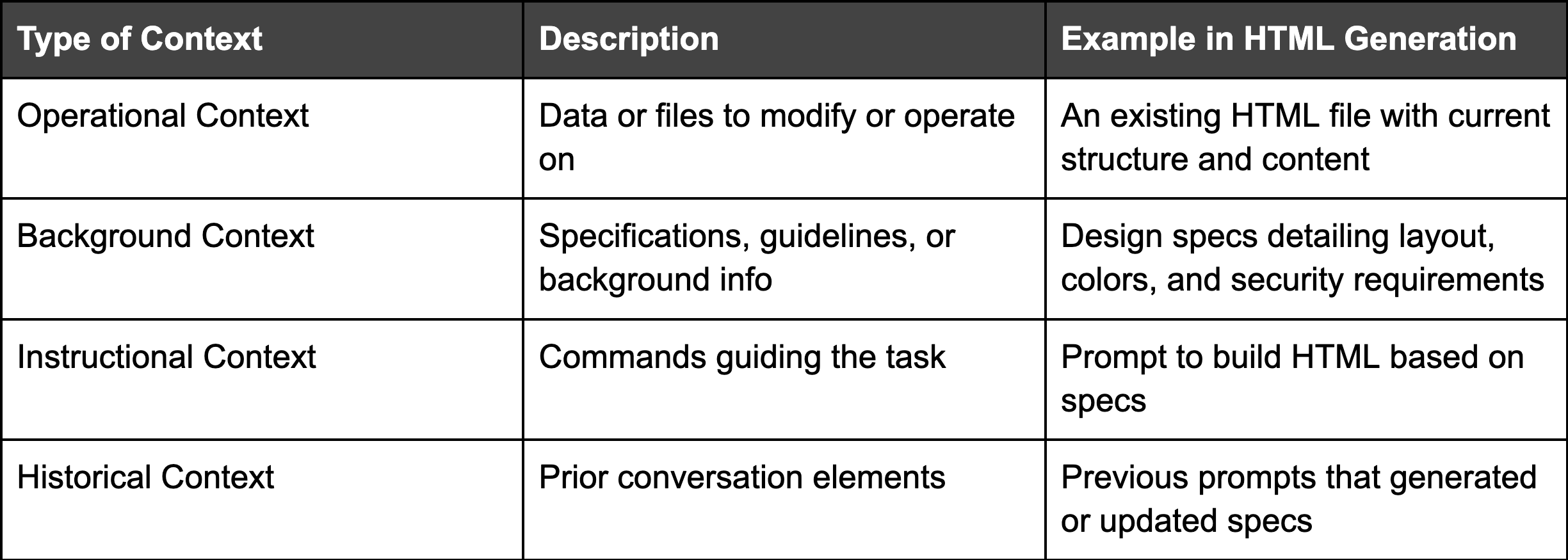 • Operational Context: This includes the core data or files that the model needs to act upon directly. For example, in code generation tasks, this might be an existing HTML file that requires modifications. Operational context is actionable and specific, forming the “what” of the task.