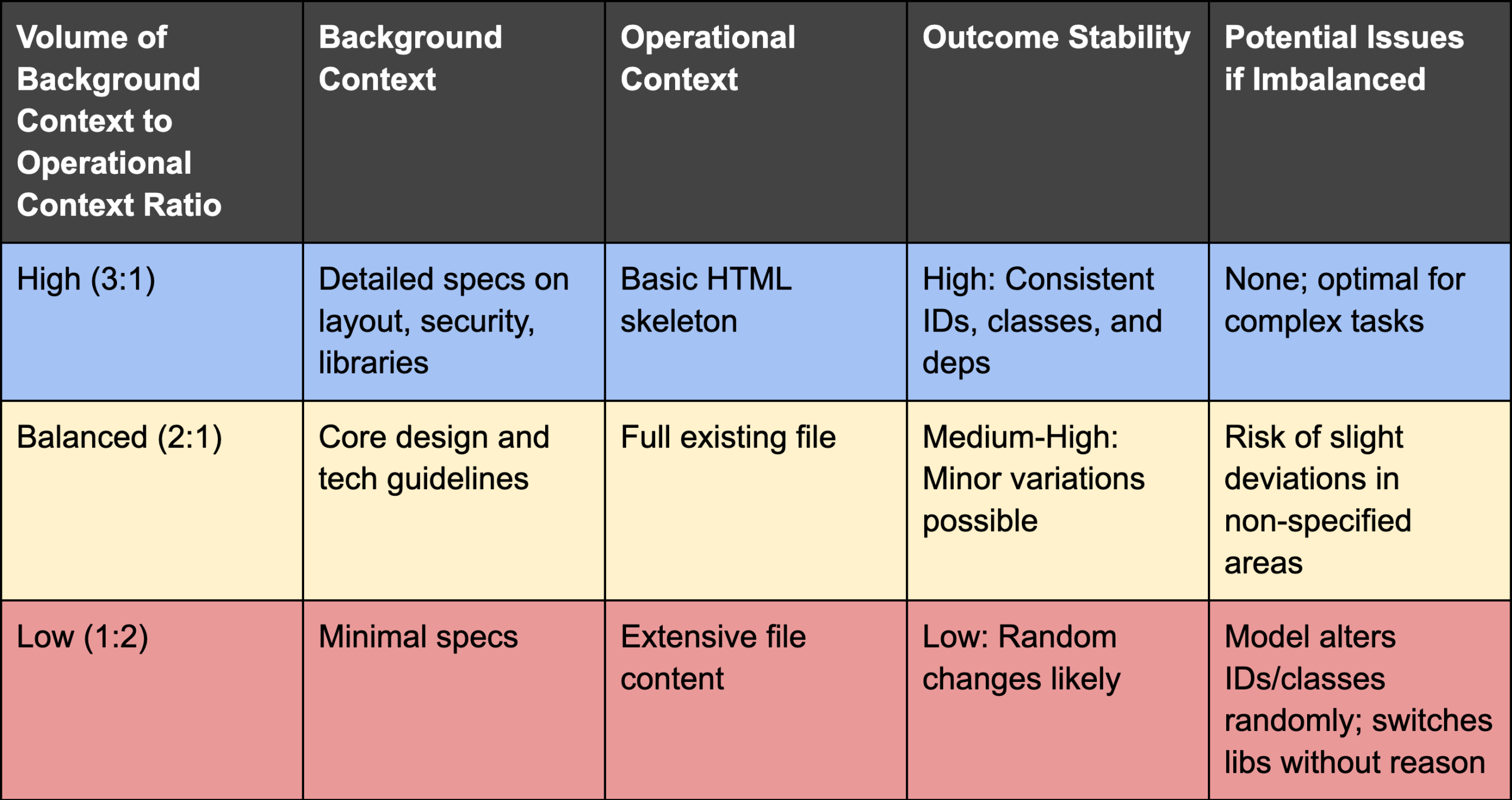 Achieving a stable outcome requires a balanced ratio of background context information (e.g., design and technical specifications) to operational context (e.g., the file being modified). A “good enough” ratio typically means providing more contextual details than raw operational data, often in a 2:1 or higher proportion depending on complexity. This ensures the context window has a high “topic/domain/subject/specification rank,” meaning the seeded specifics dominate the model’s focus.