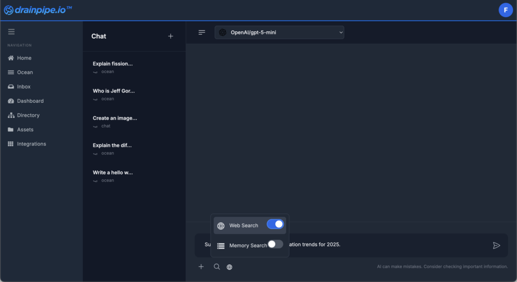 How do I activate Web Search with a Prompt when using Drainpipe Platform? Skip to main content Drainpipe Knowledge Base Search for answers or browse our knowledge base. < All Topics Main Platform Usage How do I activate Web Search with a Prompt when using Drainpipe Platform? Print PostedJanuary 6, 2026 UpdatedJanuary 6, 2026 ByChris Gaskins 0 out of 5 stars 5 Stars 0% 4 Stars 0% 3 Stars 0% 2 Stars 0% 1 Stars 0% Web Search is easily activated using the “Search” icon located below the prompt field. Click the “Search” icon, then click “Web Search” to toggle the feature to the “on” position. Now submit your prompt.
