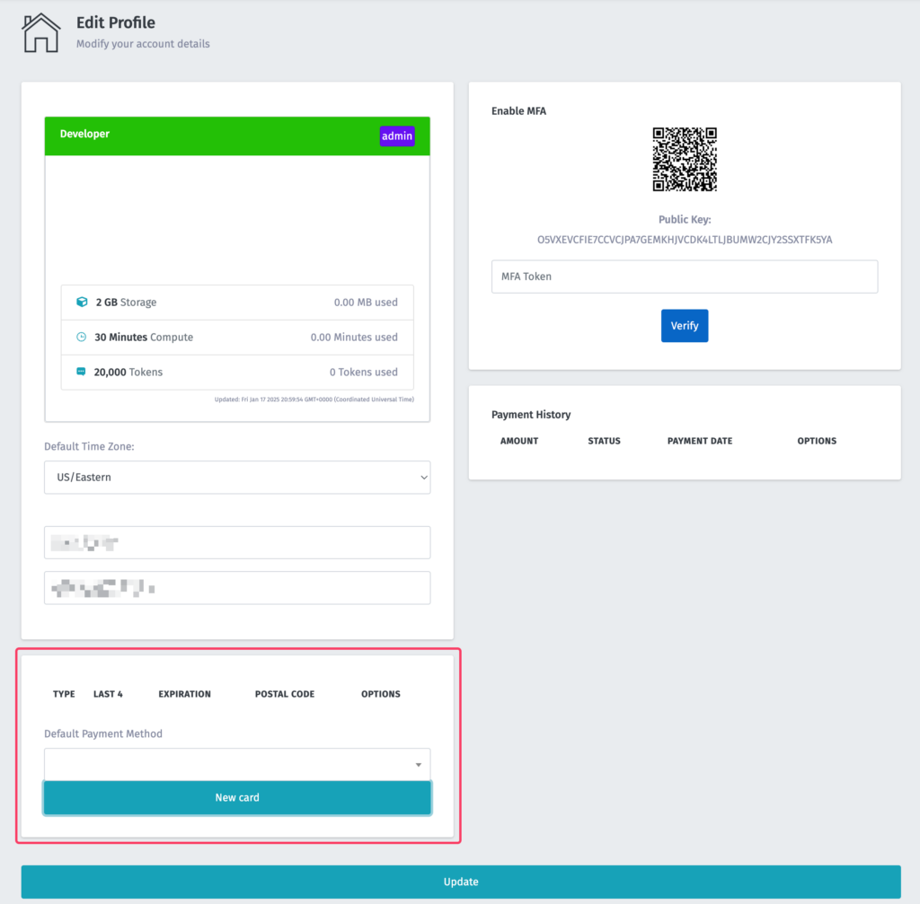 Payment methods are managed via your account profile. To access your account profile, simply click your email address in the top right corner then select Edit Profile.