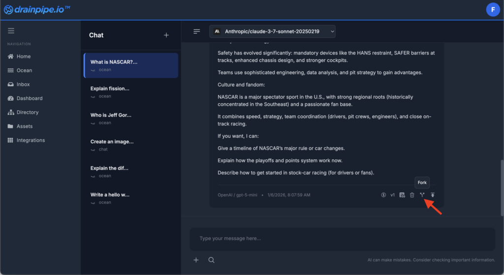 A conversation in Drainpipe Platform can be easily forked using the Fork icon located beneath the Response. Locate the response where you wish the Fork to begin and click the “Fork” icon located below response.