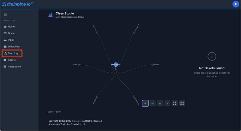 Drainpipe Platform provides a visual explorer for Class Categories. Select “Dashboard” from the left side menu and a Graph of the Class Categories will be displayed. Note the Graph controls that allow zoom in, zoom out, as well as expand and collapse of child nodes.