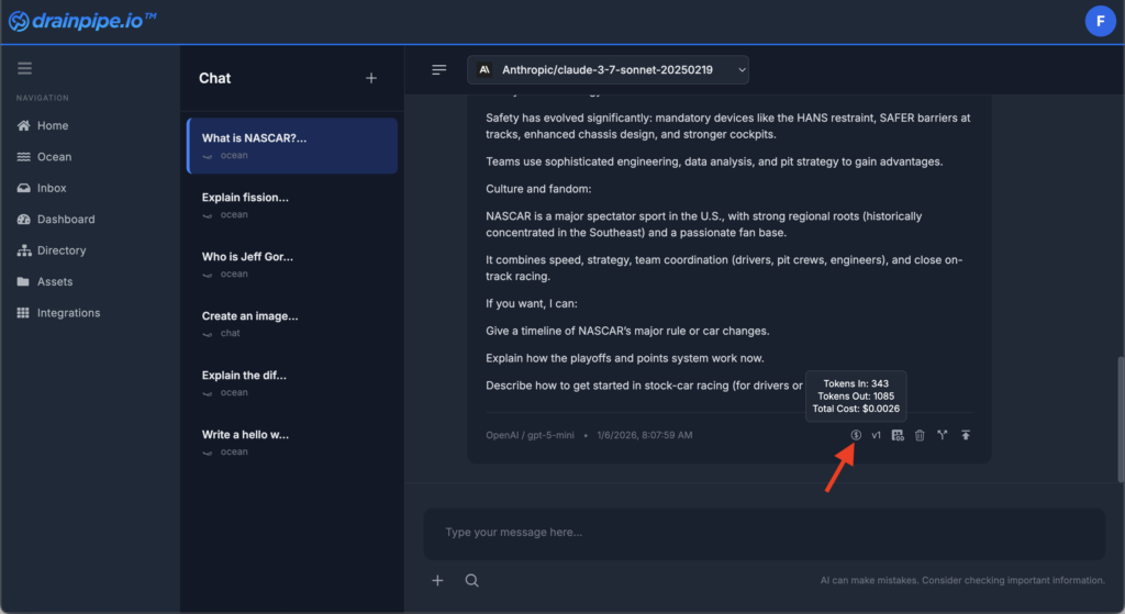 How do I view the Tokens used and cost of a Response in Drainpipe Platform? Skip to main content Drainpipe Knowledge Base Search for answers or browse our knowledge base. < All Topics Main Platform Usage How do I view the Tokens used and cost of a Response in Drainpipe Platform? Print PostedJanuary 7, 2026 UpdatedJanuary 7, 2026 ByChris Gaskins 0 out of 5 stars 5 Stars 0% 4 Stars 0% 3 Stars 0% 2 Stars 0% 1 Stars 0% Below every response in Drainpipe Platform is “Cost” icon that allows you to view the total tokens used and the cost. Locate the desired Response, then click the “Cost” icon below the response.
