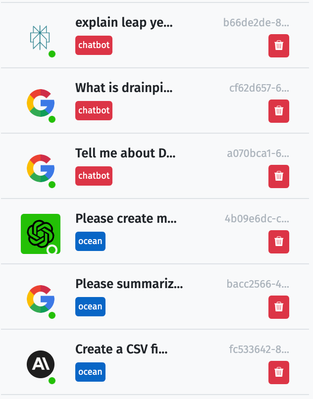 Chat histories from a chatbot show up in the Ocean interface along side all other interactive exchanges. In the list of conversations, the word “ocean” will appear for interactive sessions and the word “chatbot” will appear for conversations that were handled via the chatbot.